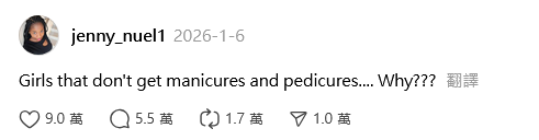 亦有不少網友以幽默方式回應。有職業拳擊手笑言:「因為我正忙着打別人。」一名機師則回覆:「因為我是按按鈕為生,Jenny。做美甲並不理想。」一名野生動物攝影師則表示:「那些熊看起來並不在乎我有沒有做美甲。」