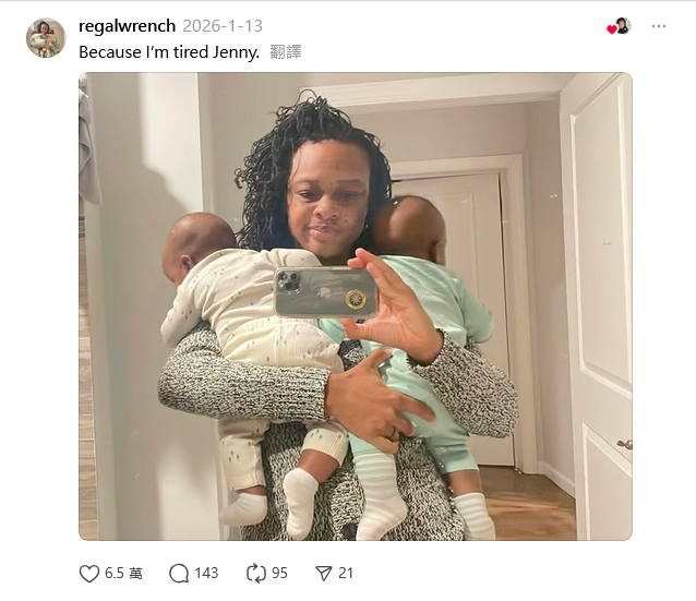 眾多留言之中,一位媽媽的回應特別引起家長們的共鳴。她貼出一張自己抱着兩個嬰兒的照片自拍,並回覆:「因為我太累了Jenny。」無數家長留言回應:「我完全懂你」、「我的孩子已經九歲了,還是會半夜把我叫醒。我完全理解你。加油,媽媽!」也有網友表示「媽媽你需要的是按摩不是美甲師。」
