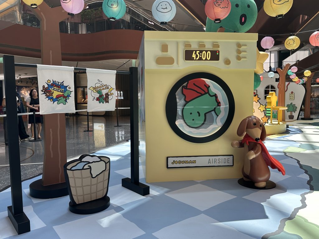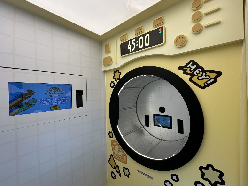 在「JOGUMAN 超能自拍洗衣機」前,可愛的萌寵WOODY正在洗衣晾衫,而裏面則內藏一部滾筒型洗衣機造型的人生四格機。粉絲們只需以港幣$60的價錢,即可拍下JOGUMAN主題的人生四格,並獲得實體相片及數碼檔案一張,將獨一無二的珍貴時刻帶回家。