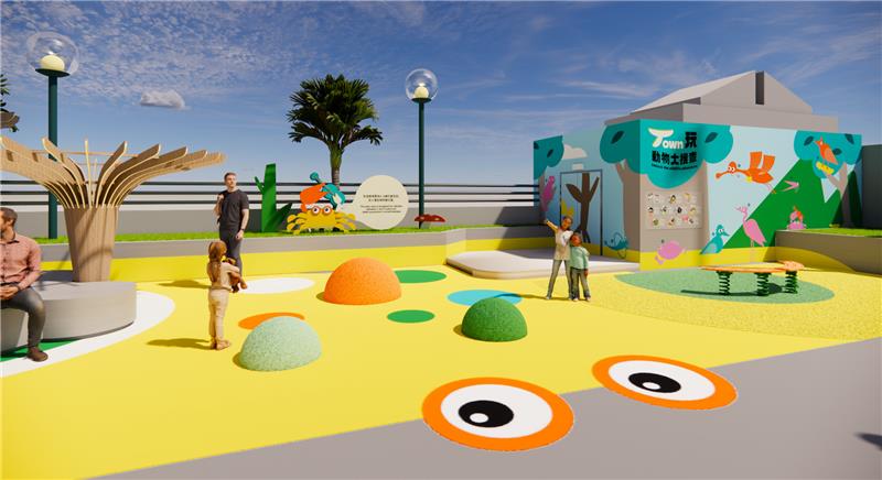 「Town玩 紅樹林」區內有黑棕環紋尾巴的小靈貓做代表的「靈貓轉轉樂」;跳躍之王樹蛙帶你玩「樹蛙彈彈床」;短吻果蝠帶來「蝙蝠旋風塔」;還有漂亮的蝴蝶與「蝶舞鞦韆」。另一個「Town玩 彈塗魚」區則以彈塗魚跳跳紮的得意動作,設計出一個可以自由跳躍的障礙物區,讓小朋友盡情發揮跳躍潛能。最後來到「Town玩 平衡車場」,小朋友可以平衡車作對決,憑速度、膽量與平衡力稱王。