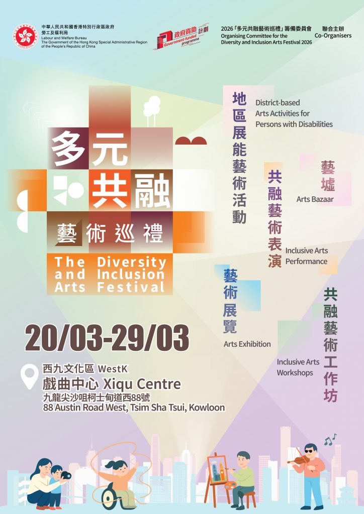 2026「多元共融藝術巡禮」,將於3月20日至29日一連10日在西九文化區戲曲中心舉行。今年活動將透過藝術展覽、共融藝術表演、藝墟、共融藝術工作坊及地區展能藝術活動等多元形式,展現殘疾人士的創意與多元才能,同時讓公眾在欣賞藝術之餘,以輕鬆方式重新思考「共融」在生活中的真正意義。