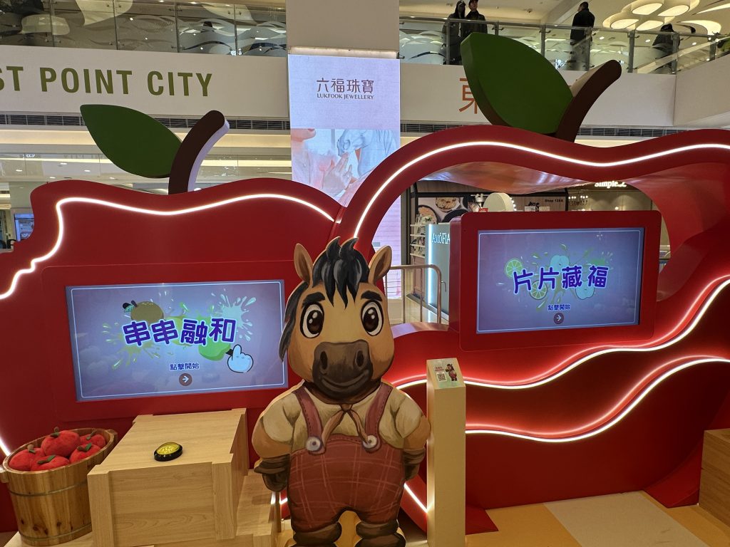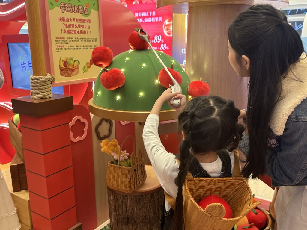 「幸福水果店」則有兩大互動遊戲「片片藏福」和「串串融和」。於「片片藏福」中,參加者需要在限時內在水果落地前揮指切開;而「串串融和」則需配合音樂節奏,把螢光幕上的水果串成一串,考驗小朋友的節拍感。