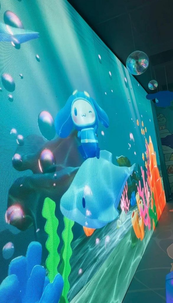 海濱樂園「深海夢幻探險」則設有故事互動體驗,小朋友可挑選自己喜歡的Sanrio Characters,為其配備專屬潛水裝備,即可獲得神奇的能量石,展開一場神秘的海底探險。進入水底光影隧道後,可以使用能量石召喚不同的Sanrio Characters動畫,增添互動趣味;隨後小朋友將來到海底城鎮,尋找彩虹珍珠貝,協助海洋王國解決能量危機。整個體驗結合可愛多變的Sanrio Characters以及趣味滿滿的互動裝置,讓參加者能夠全方位投入在這個水底探險之旅。