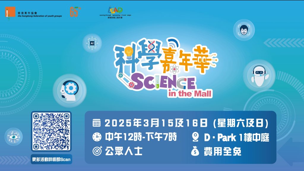 香港青年協會創新科學中心自2009年起成立,致力為中小學生、教師及家長提供一個集探索、研究及體驗科學與科技的一站式STEAM學習平台,並會定期舉辦工作坊及講座、全港大型科學比賽、科學優才培訓、教學培訓、公眾嘉年華及科學活動等,亦設有超過110個常設STEAM課程。是次一連兩日於荃灣舉辦的「科學嘉年華:Science in the Mall」,將會設有兩大免費互動遊戲區、12場免費STEAM親子工作坊,以及多場神奇有趣的科學劇場,更有AI照相館,讓親子一同體驗目前流行的Stable Diffusion圖像生成技術。所有活動費用全免!
