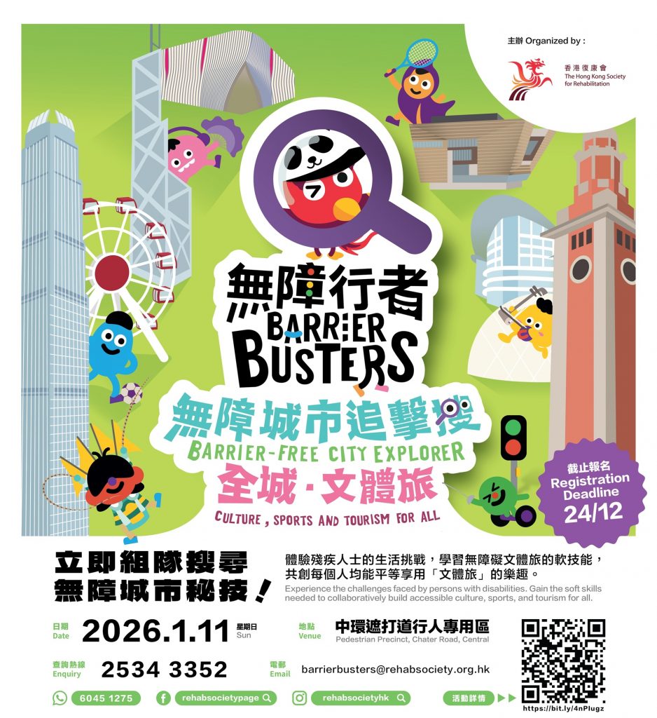 殘疾人士與長期病患出行,往往受制於社區的無障礙設施配套及設計。有調查發現香港整體近六成基礎無障礙設施,有設計不夠周全、行程規劃資訊不足、職員意識不足、購票系統未如理想等問題,影響殘疾及有需要人士參與各項文體旅活動。為推廣讓殘疾人士及長期病患者能平等地使用文體旅設施和服務,享受文體旅活動的樂趣,香港復康會將於來年一月於中環遮打道行人專用區舉行新一屆「無障行者——無障城市追擊『搜』」,冀透過城市定向體驗賽及嘉年華,讓社會及公眾瞭解驗殘疾人士及長期病患者的生活挑戰,建立一個關愛和共融的社會。