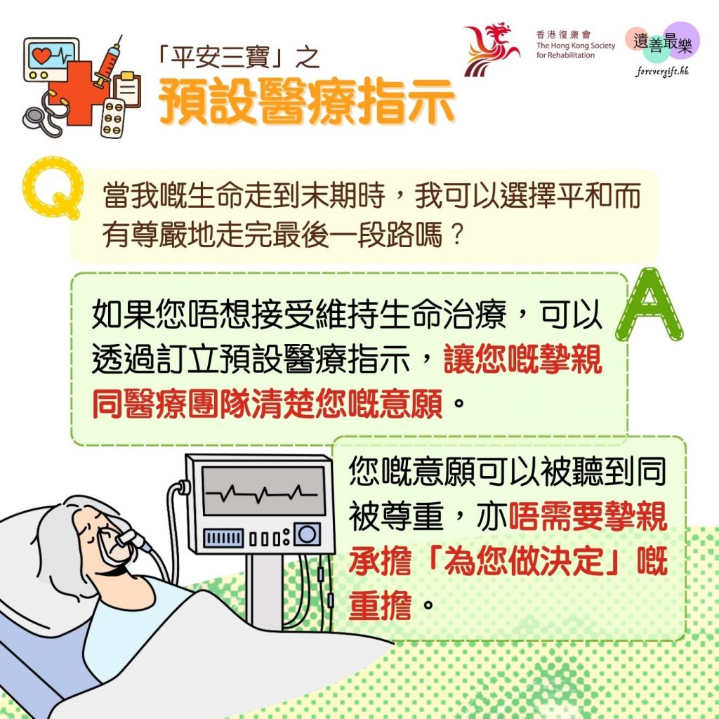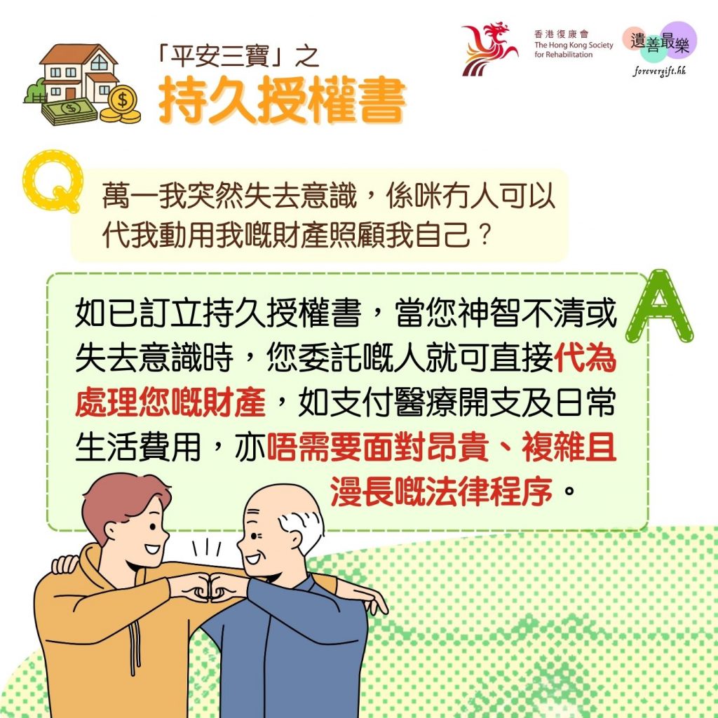 「平安三寶」是指遺囑、持久授權書以及預設醫療指示三項重要法律工具,透過在長者或長期病患者神智清醒時及早作出適當規劃,有助他們妥善安排生前的醫療指示以及身故後的財產分配,亦可避免親友之間為相關事宜產生誤會與爭執。