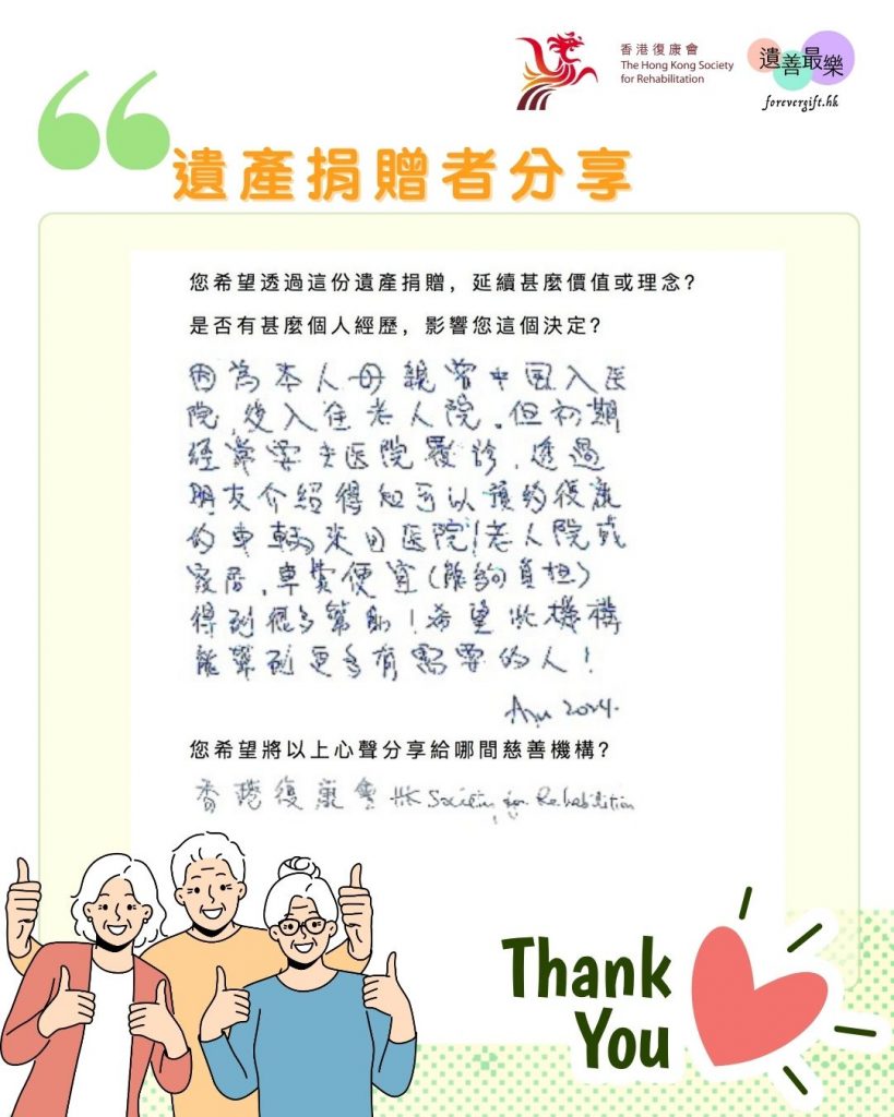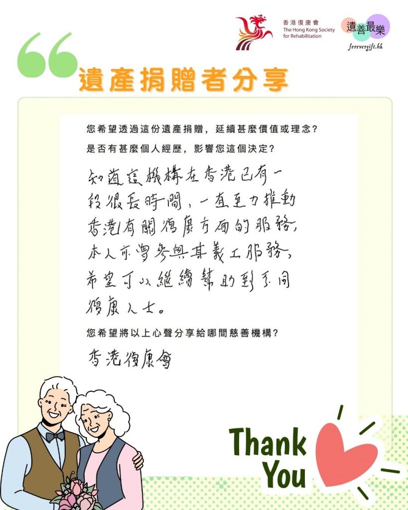 香港復康會行政總裁梁佩如博士表示:「有見社會大眾越來越重視臨終前的財產與醫療規劃,我們十分高興能夠與遺善最樂合作舉行免費法律講座,向社會大眾講解遺囑、持久授權書及預設醫療指示的知識及處理方式,並希望參與人士透過加深瞭解後,願意以遺產捐贈的方式,支持我們的服務發展,讓捐贈者對社會上有需要人士的愛和關懷得以延續。」