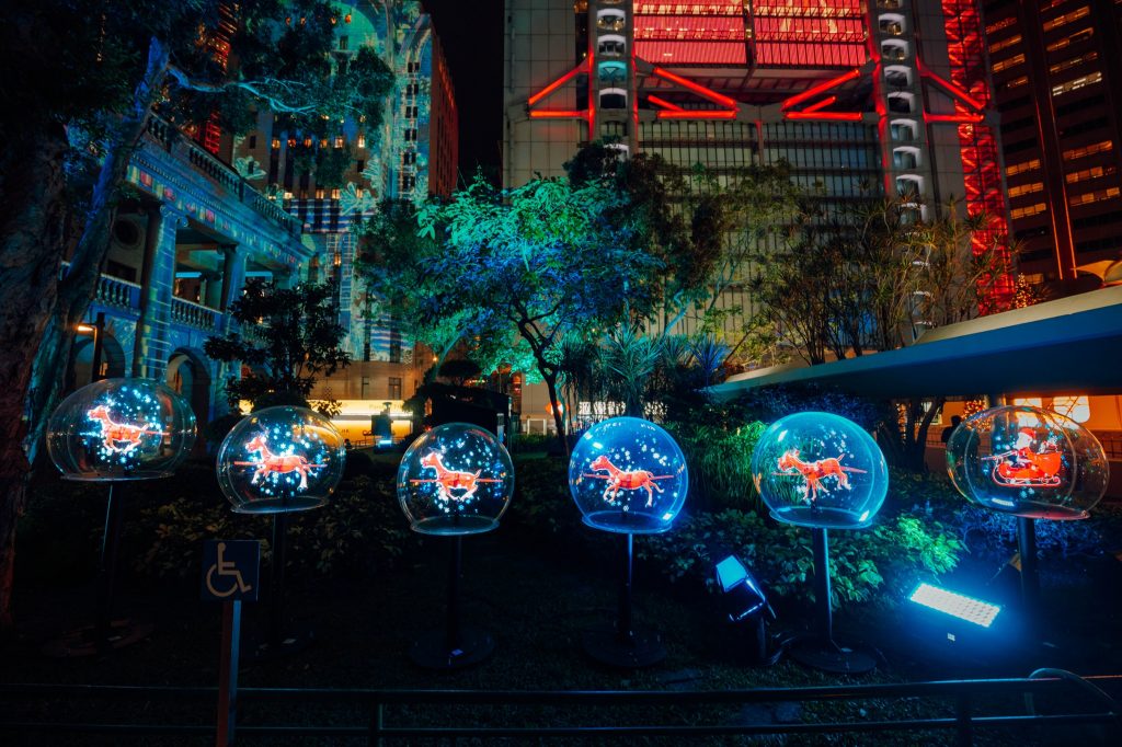 翩翩起舞的天使、聖誕老人乘坐雪橇送禮物、雪人歡欣旋轉起舞等冬日場景整晚環繞「聖誕天地」,栩栩如生的冬日聖誕影像同時呈現在場內約30個立體全息投影球,市民和旅客可近距離打卡,提升觀賞體驗。九首經典節日樂曲亦重新編曲,包括《Santa Claus is Coming to Town》、《It’s the Most Wonderful Time of the Year》等,貫穿整個演出打造沉浸式視聽體驗。平安夜(12月24日)、聖誕節(12月25日)及除夕(12月31日)當晚,演出時間將特別延長至凌晨1時。