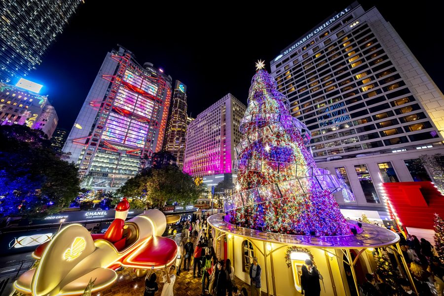 中環皇后像廣場花園率先化身為繽紛「聖誕天地」,悠揚經典聖誕旋律圍繞全場,營造濃厚冬日氛圍。場內最矚目是20 米高、相當於六層樓的巨型聖誕樹閃爍登場,聖誕樹燈光效果流轉多變,綻放出繽紛奪目圖案。與場內28棵掛滿金、紅、銅三色聖誕裝飾的迷你聖誕樹互相輝映。