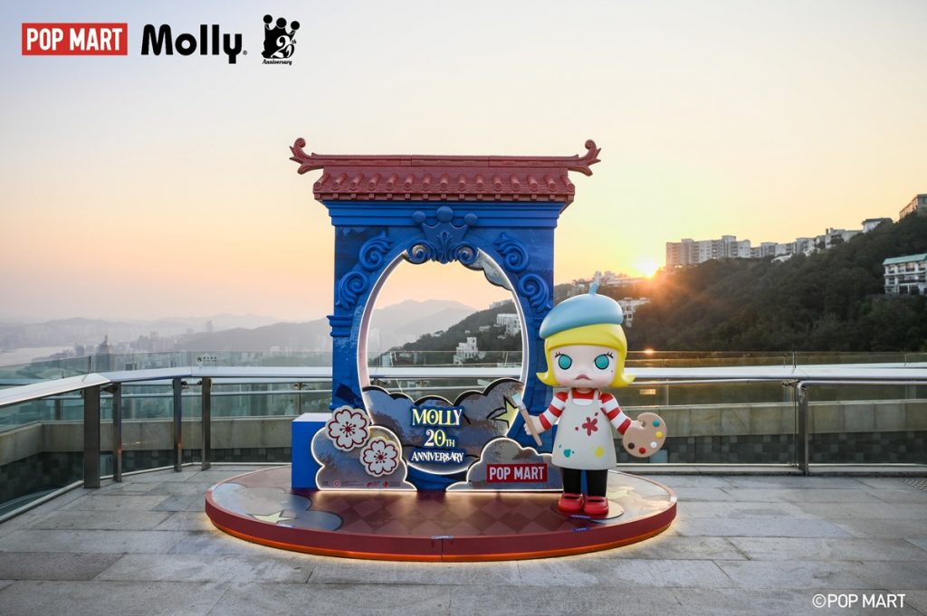 山頂廣場內亦設有期間限定的「POP MART MOLLY 20周年主題期間限定店」,門外有「風和日麗」MOLLY周年雕塑可以打卡,店內亦加設了多幅Kenny老師為MOLLY 20周年特別設計的插畫,供粉絲細味。