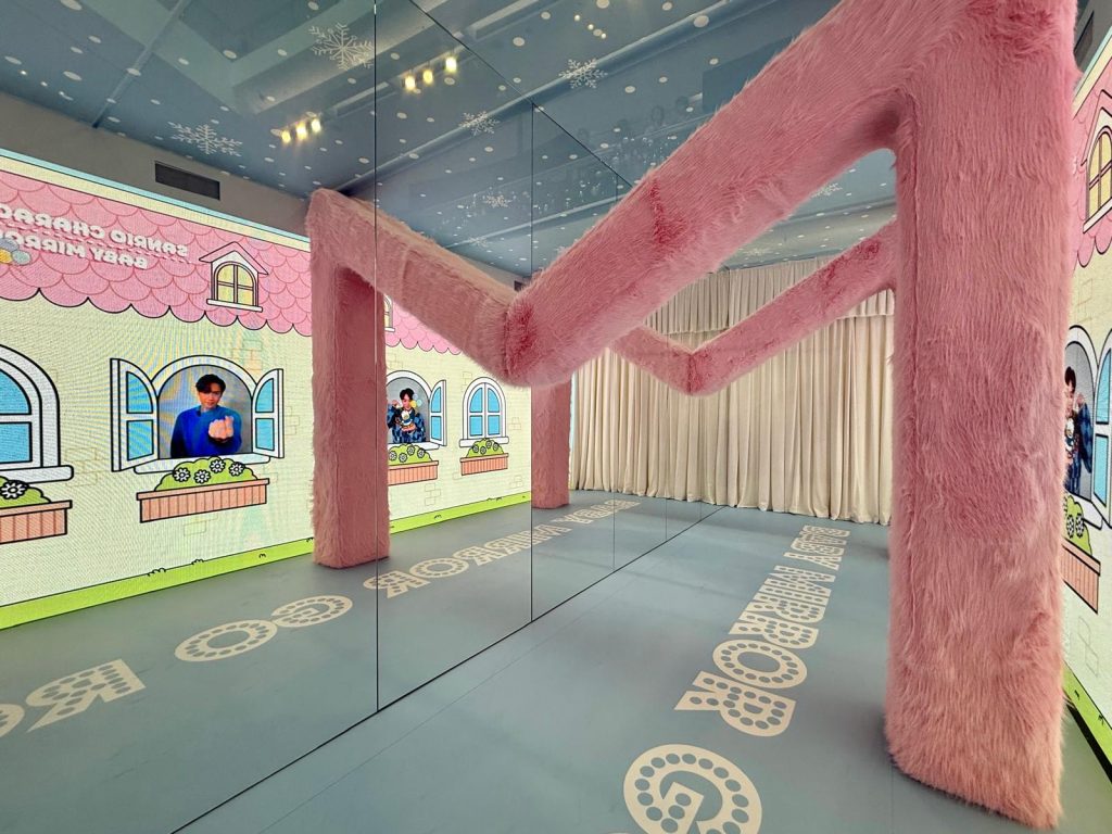 除了中庭的旋轉木馬,還有另一個粉絲們不可錯過的打卡位 ── M字標記夢幻隧道。這間結合鏡面、燈光與LED牆的房間,透過鏡的倒映可以讓你與巨型粉紅色毛毛M字標記自拍合照,LED牆則輪流播放MIRROR成員與其SANRIO角色的互動片段。