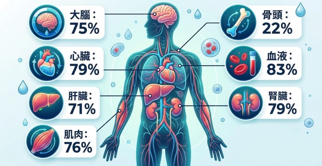 水對人體非常重要,是維持身體正常運作不可缺少的一部分。我們的身體約有60%至70%由水分組成,也是構成心、肝、脾、肺、腎、腦、血液以及肌肉等的主要成份。水亦負責把養分運送至身體不同地方,讓各個器官正常運作;同時,身體亦會透過流汗來調節體溫,排走不需要的廢物。
