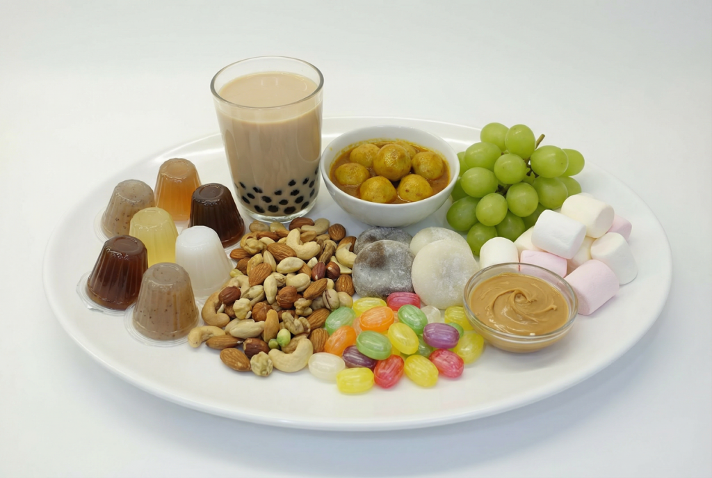 除了蒟蒻果凍或珍珠,對小朋友而言,細小而堅硬的食物,例如果仁或小顆的硬糖;細小的球形食物如魚蛋和提子;難以咀嚼的食物如麻糬和糯米糍、可壓縮的食物如棉花糖,以及厚稠糊狀的醬如花生醬,亦屬容易鯁喉的食物,必須坐定定,小口細嚼慢嚥,切忌邊玩邊笑邊吃,以防哽噎風險。